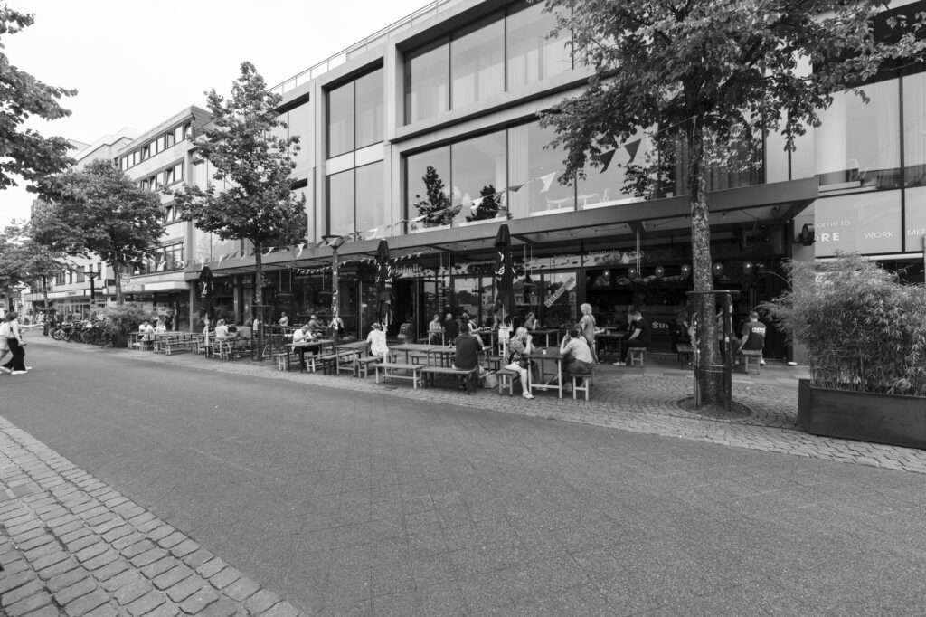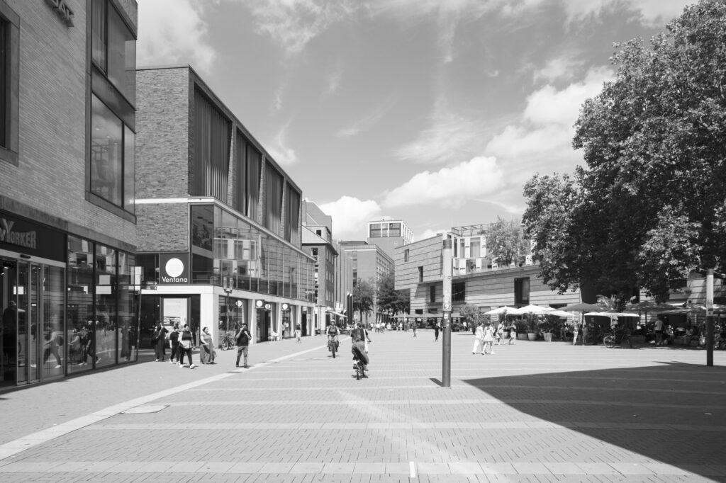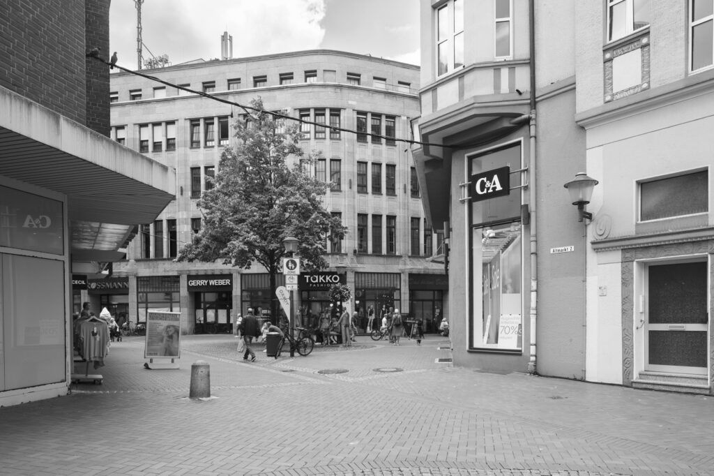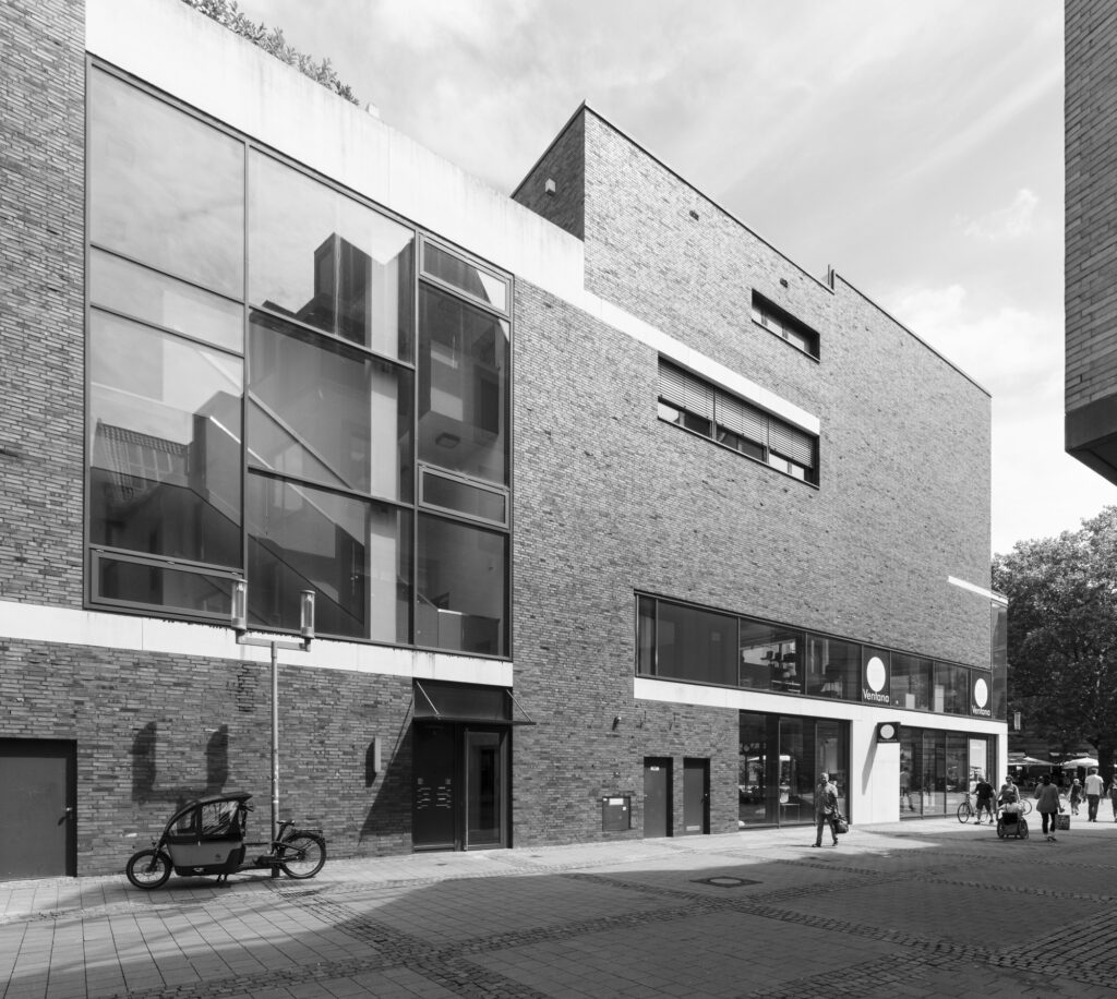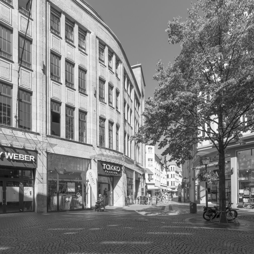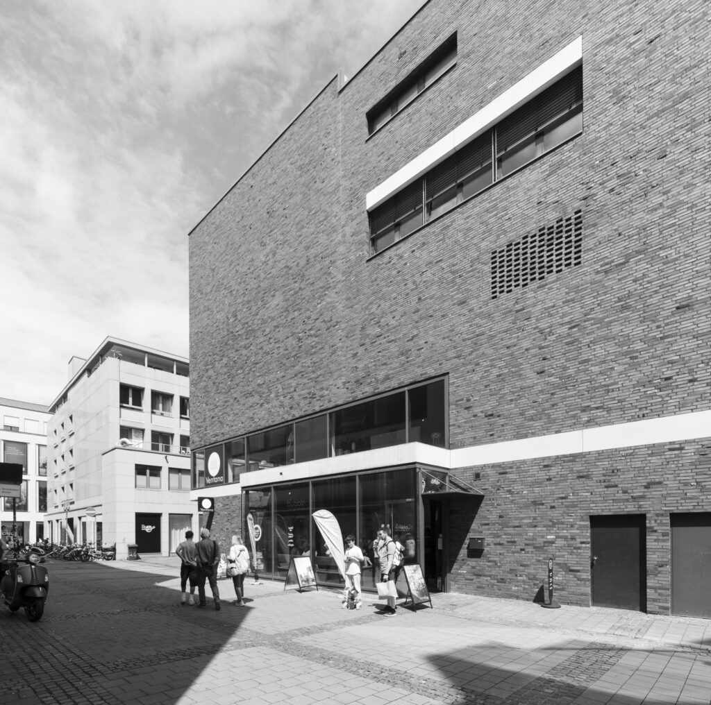 Parkhaus Stubengasse, Münster. früher ein Parkhaus, heute Mehrzweck: Wohnen, Möbelhaus, Büros, Fahrradgarage, Saftladen, Tiefgarage bzw Anlieferung des benachbarten Kaufhauses