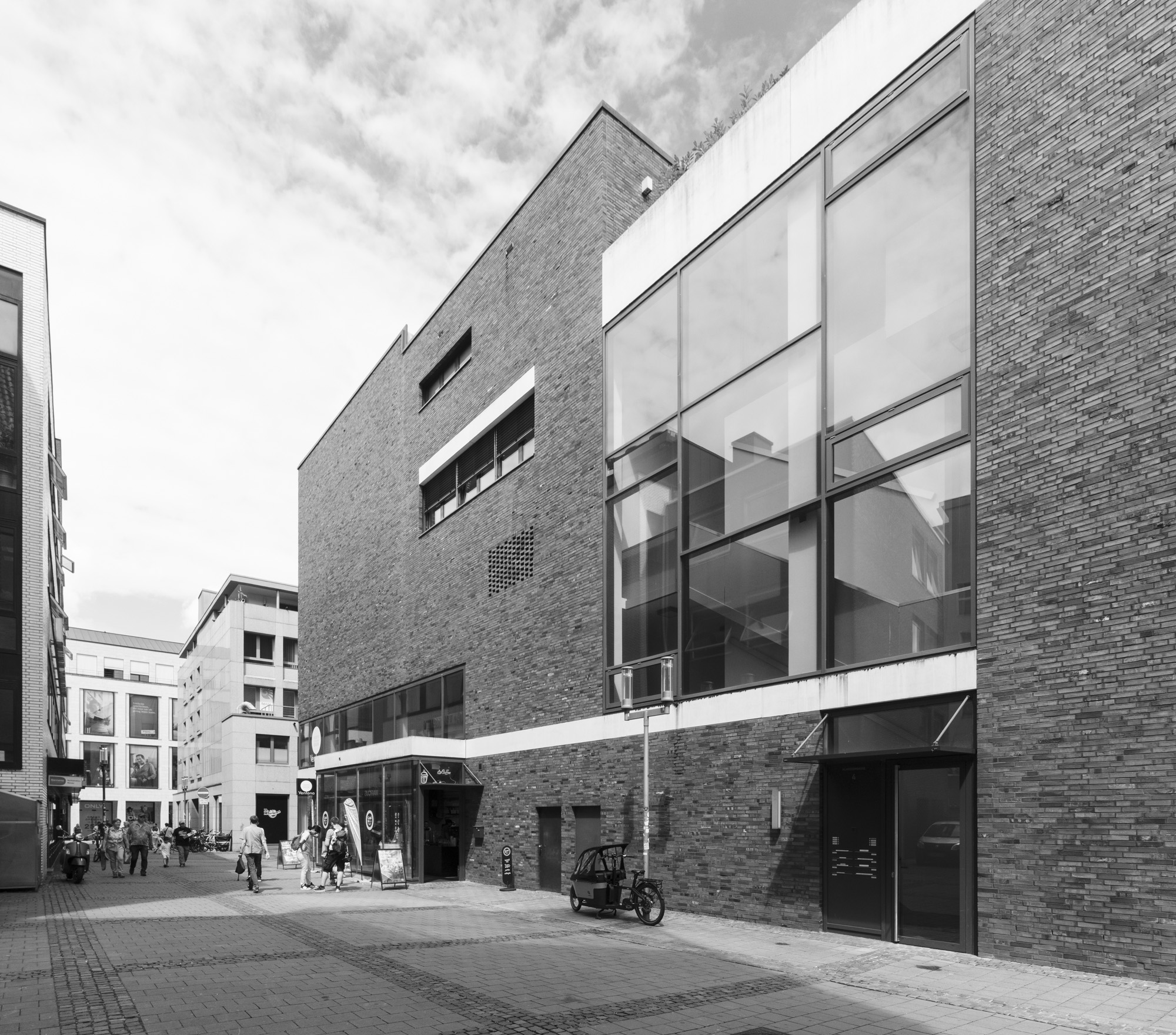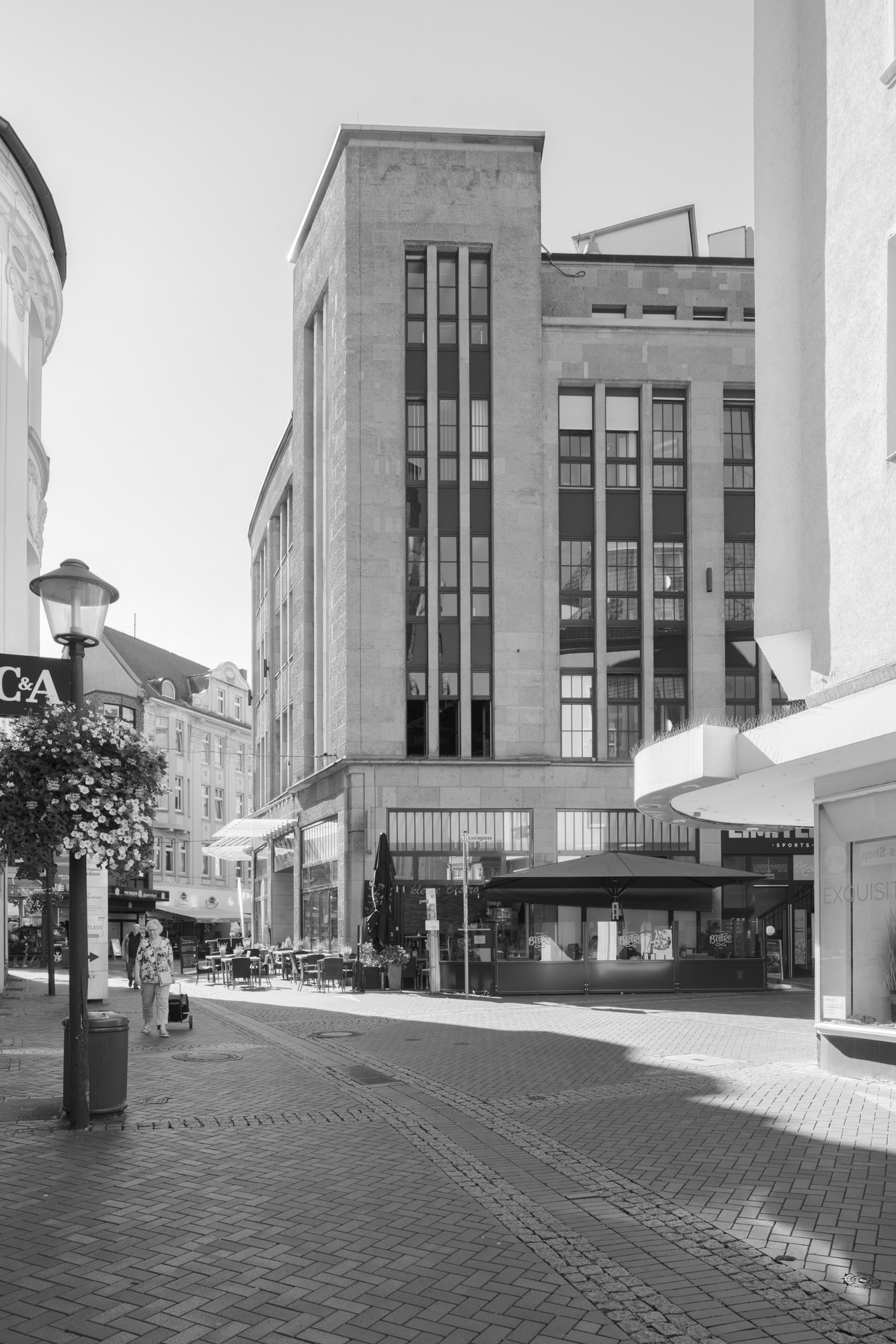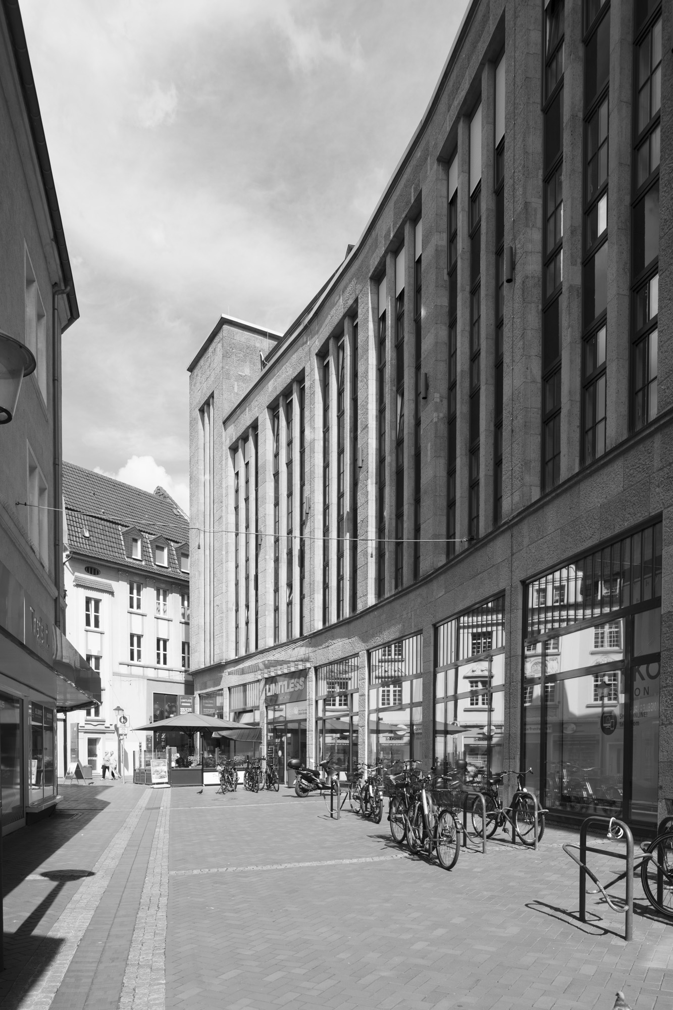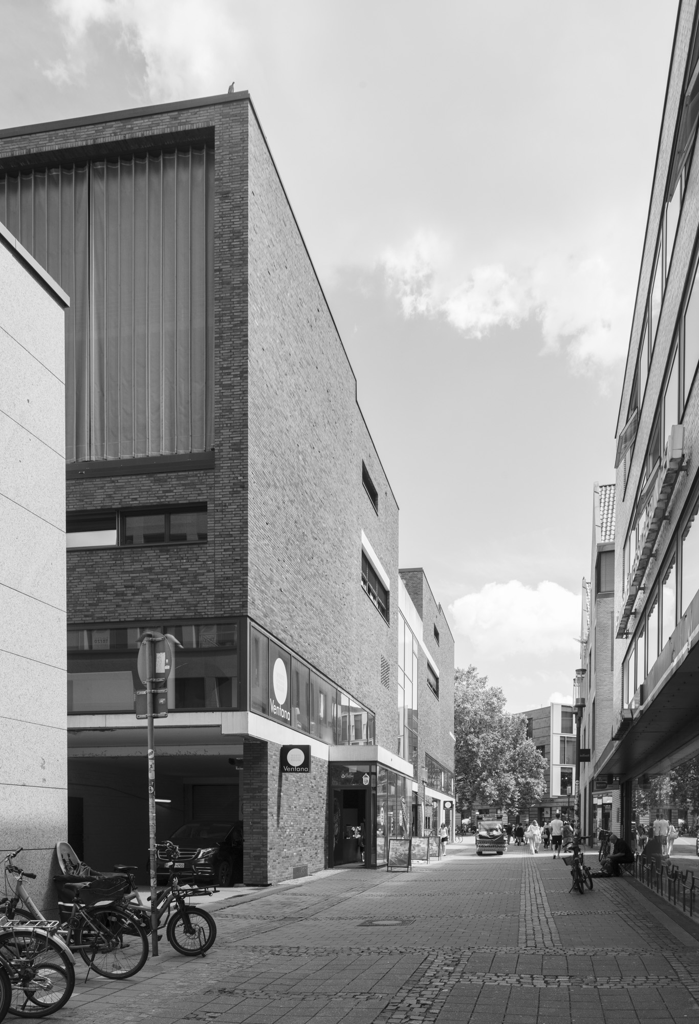 Parkhaus Stubengasse, Münster. früher ein Parkhaus, heute Mehrzweck: Wohnen, Möbelhaus, Büros, Fahrradgarage, Saftladen, Tiefgarage bzw Anlieferung des benachbarten Kaufhauses