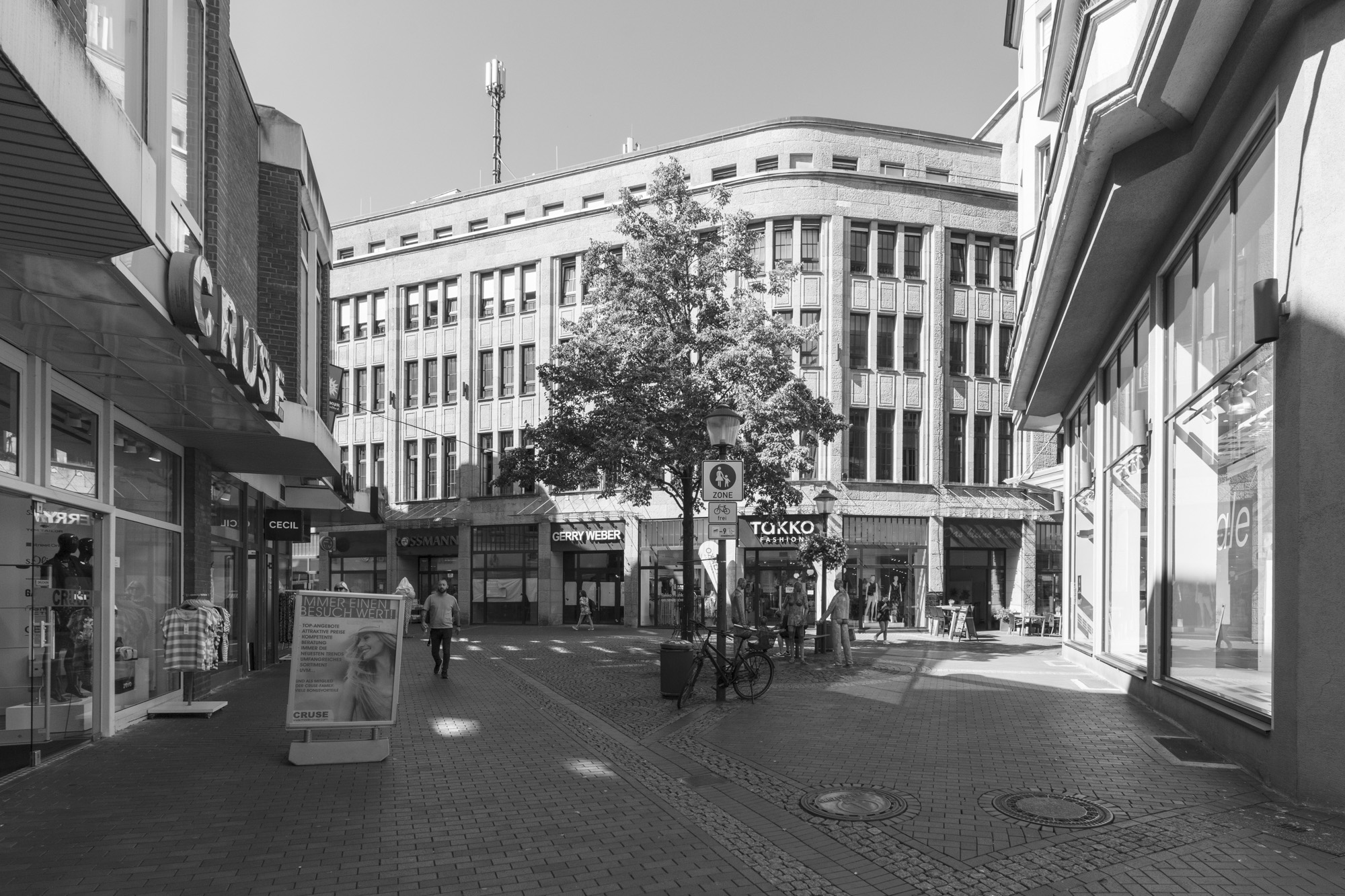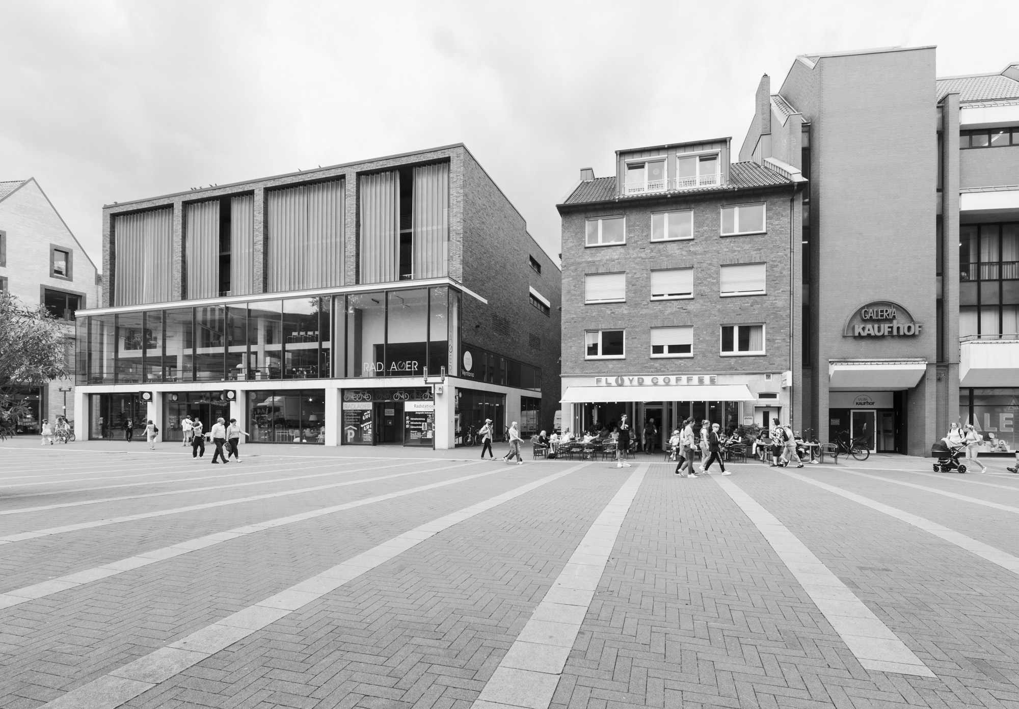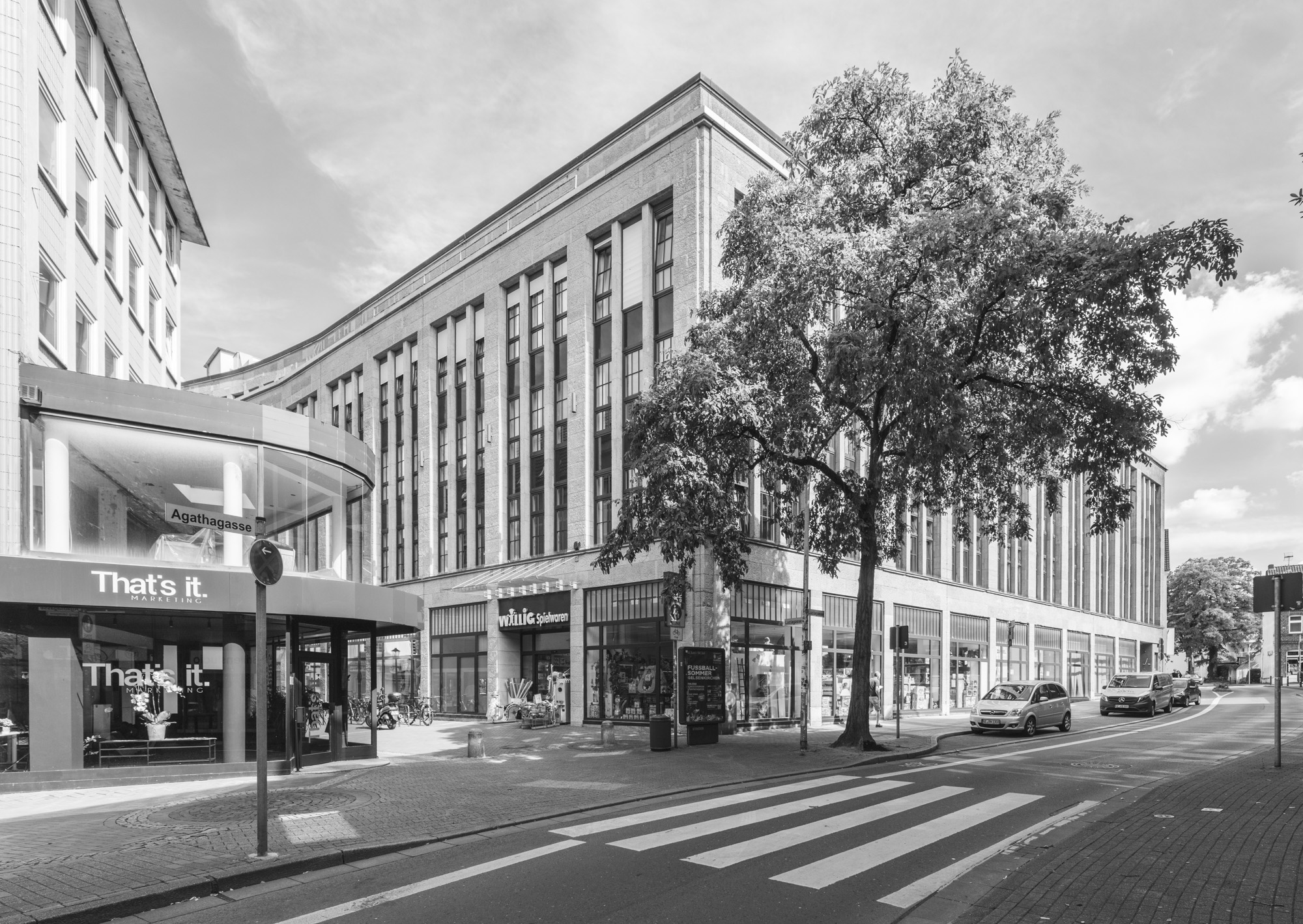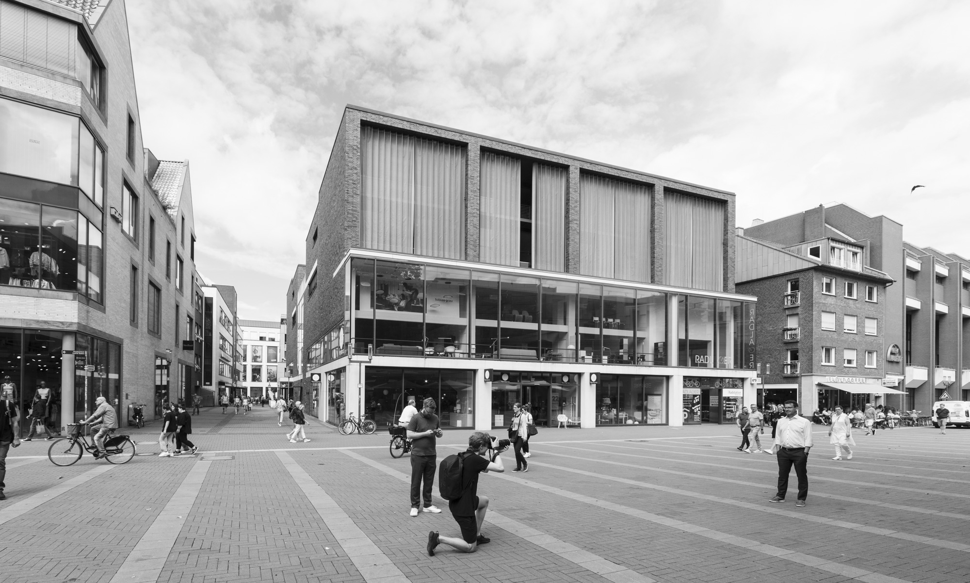 Parkhaus Stubengasse, Münster. früher ein Parkhaus, heute Mehrzweck: Wohnen, Möbelhaus, Büros, Fahrradgarage, Saftladen, Tiefgarage bzw Anlieferung des benachbarten Kaufhauses