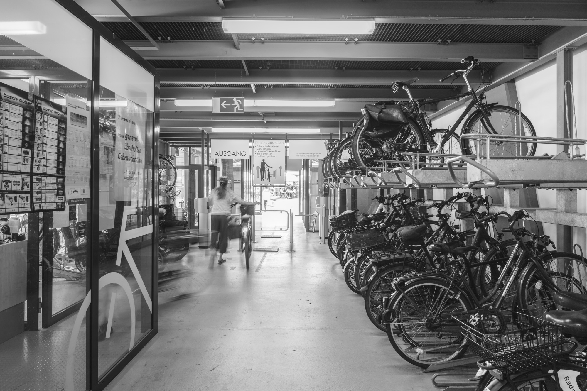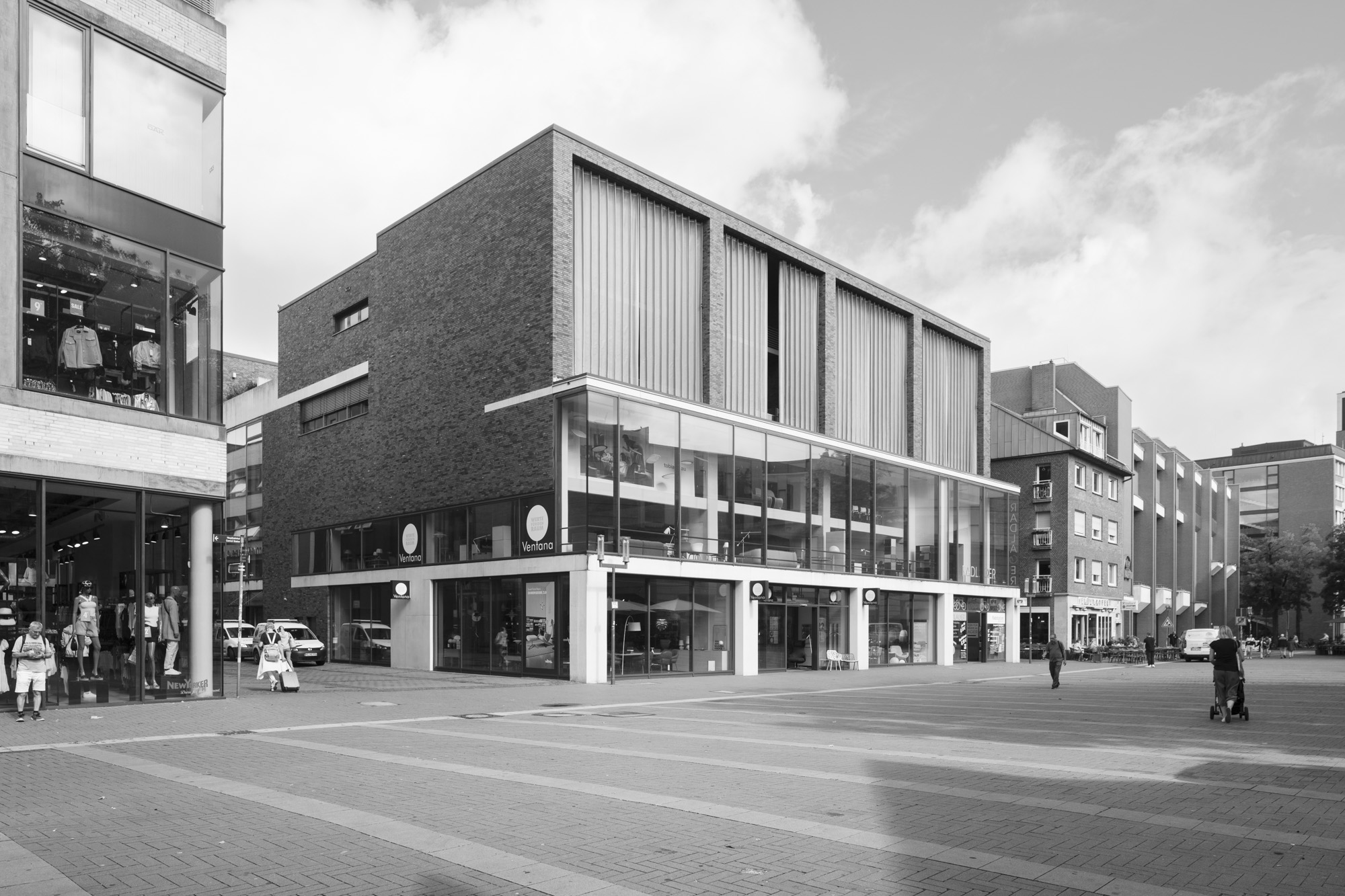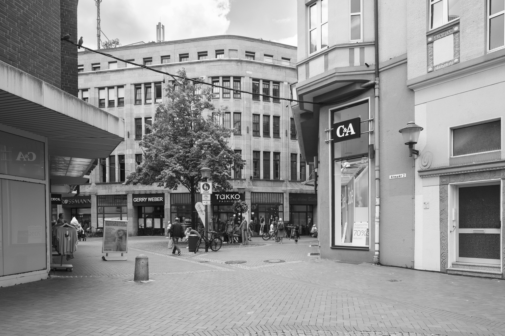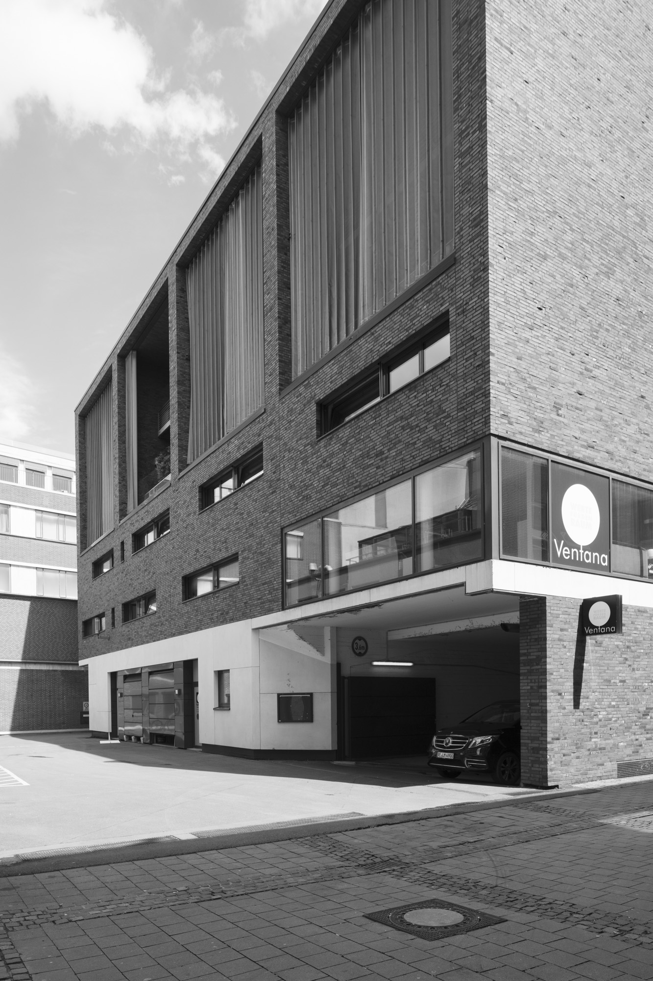 Parkhaus Stubengasse, Münster. früher ein Parkhaus, heute Mehrzweck: Wohnen, Möbelhaus, Büros, Fahrradgarage, Saftladen, Tiefgarage bzw Anlieferung des benachbarten Kaufhauses